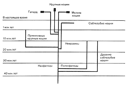 Все представители кошачьих принадлежат семейству плотоядных млекопитающих, которые насчитывают 38 видов из 5 родов. Наибольшее количество видов имеют мелкие кошки всего из двух родов. Каждая кошка является умелым охотником, главным рационом которого является мясо других позвоночных животных. Образ жизни всех представителей семейства кошачьих (кроме льва), отличается индивидуализмом. Считается, что первые кошки появились 60-40 миллионов лет назад от первых млекопитающих хищников (кредонтов). В начале олигоцена жили животные, напоминающие виверру, а затем в миоцене, — животные, уже более похожие на кошек. Современные кошки появились в конце миоцена и в неоцене. Т.к. в это время на суше было много открытых сованн с большим количеством дичи, первые кошки были довольно крупными животными. Наоборот, в ледниковые периоды, когда дичи становилось мало, появлялись мелкие дикие кошки. По ряду фактов, прародителем домашних кошек считается африканский дикий кот. Известно, что 3,5 тыс. лет назад кошка уже была одомашнена. Но когда ее начали приручать, ученые не знают и сейчас. Наиболее ранние обнаруженные останки кошек датируются иерихонским периодом неолита — это седьмое тыс. до нашей эры, — однако этот факт не является доказательством, что кошка тогда уже была одомашнена. Многие ученые полагают, что первая домашняя кошка появилась в Египте. Но существует информация, что одомашнивание кошек проходило и в других регионах, что подтверждают раскопки. Доисторическая кошкаВстречаясь почти на всех континентах, дикие кошки всегда привлекали внимание человека совершенством форм и поведения. Семейство кошачьих насчитывает около 35 видов. В семейство входят высокоспециализированные хищники, достигшие как бы вершины эволюционного развития отряда.Около десятков миллионов лет потомки исходных насекомоядных животных разделились на различные эволюционные ветви, в них уже прослеживается сходство с современными млекопитающими. Одна такая эволюционная ветвь начинается с небольшой группы животных, которые постепенно сменили пищу и из насекомоядных превратились в плотоядных. Это были миациды — предки всех современных хищников. Они были похожи на насекомоядных сородичей: невелики в размерах, коротконогие, с длинным туловищем и узкими вытянутыми мордами. Однако череп у них был крупнее, предполагается, что их мозг отличался большей сложностью. В дальнейшем миациды, в свою очередь, стали предками других животных, точнее — десяти существующих семейств плотоядных. Три из этих семейств (ушастые тюлени, настоящие тюлени и моржи) вернулись в море и заново приспособились к жизни в нем. Ни в одном из семи оставшихся на суше семейств енотовые, медвежьи, собачьи, куньи, ниверровые, гиеновые и кошачьи не развились такие фантастические формы, как у их морских сородичей. Наоборот, они стали быстрее и зорче, развили более тонкий слух и обоняние, но в остальном не приобрели особых отличий. Три ветви современного семейства кошачьих (мелкие кошки, крупные кошки, гепарды) начали развиваться от общих предков — неофелид. Примерно в это же время появилась еще одна боковая ветвь кошачьих — палеофелиды, представленная двумя группами — нимравинами и древними саблезубыми кошками. Эти последние просуществовали около 30 млн. лет, а затем по неизвестным причинам вымерли. Неоф